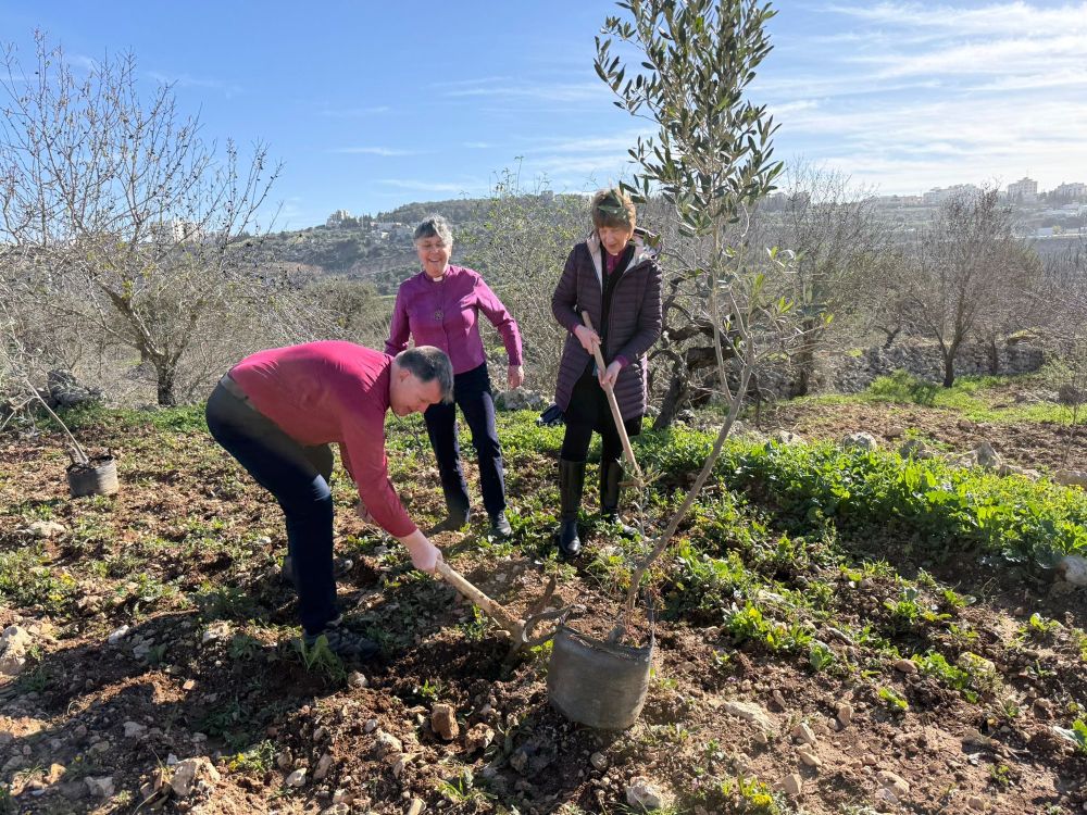 The three English bishops, Bishop Graham Usher, Bishop Guli Francis-Dehqani and Bishop Rachel Treweek, joined Jewish Rabbis from the group Rabbis for Human Rights to plant olive trees with Christian Palestinian Wasim, at his farm outside Bethlehem.