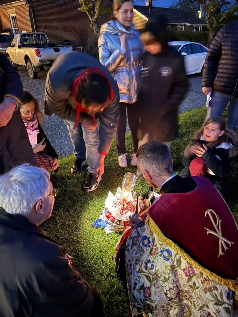 In Eastern Europe it is traditional to bring baskets for a blessing at Easter. The baskets includes Pascha Breads, Cakes, cheeses, meats, herbs, salt, decorated boiled eggs and a candle. The Rector, Fr Carl and Fr Oswin from Mirfield had a good look at the beautiful baskets and spoke to families about their life here in the UK and Ukraine.