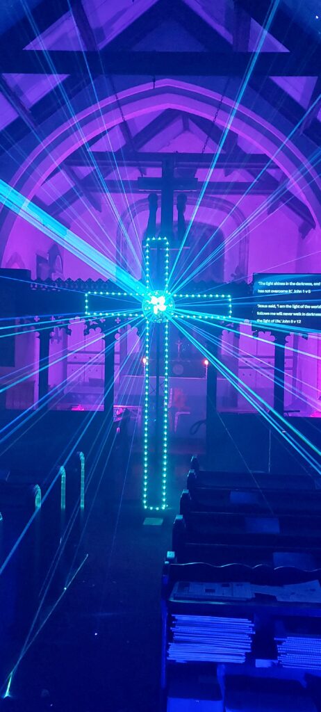 We set up a light trail across the churchyard leading down to the church. Inside the church was a large steel cross with part of a disco ball attached which reflected coloured beams of light shining into each corner of the church as a laser beam hit it. Bible verses came up on the screens, ambient music played in the background with the smell of incense burning.