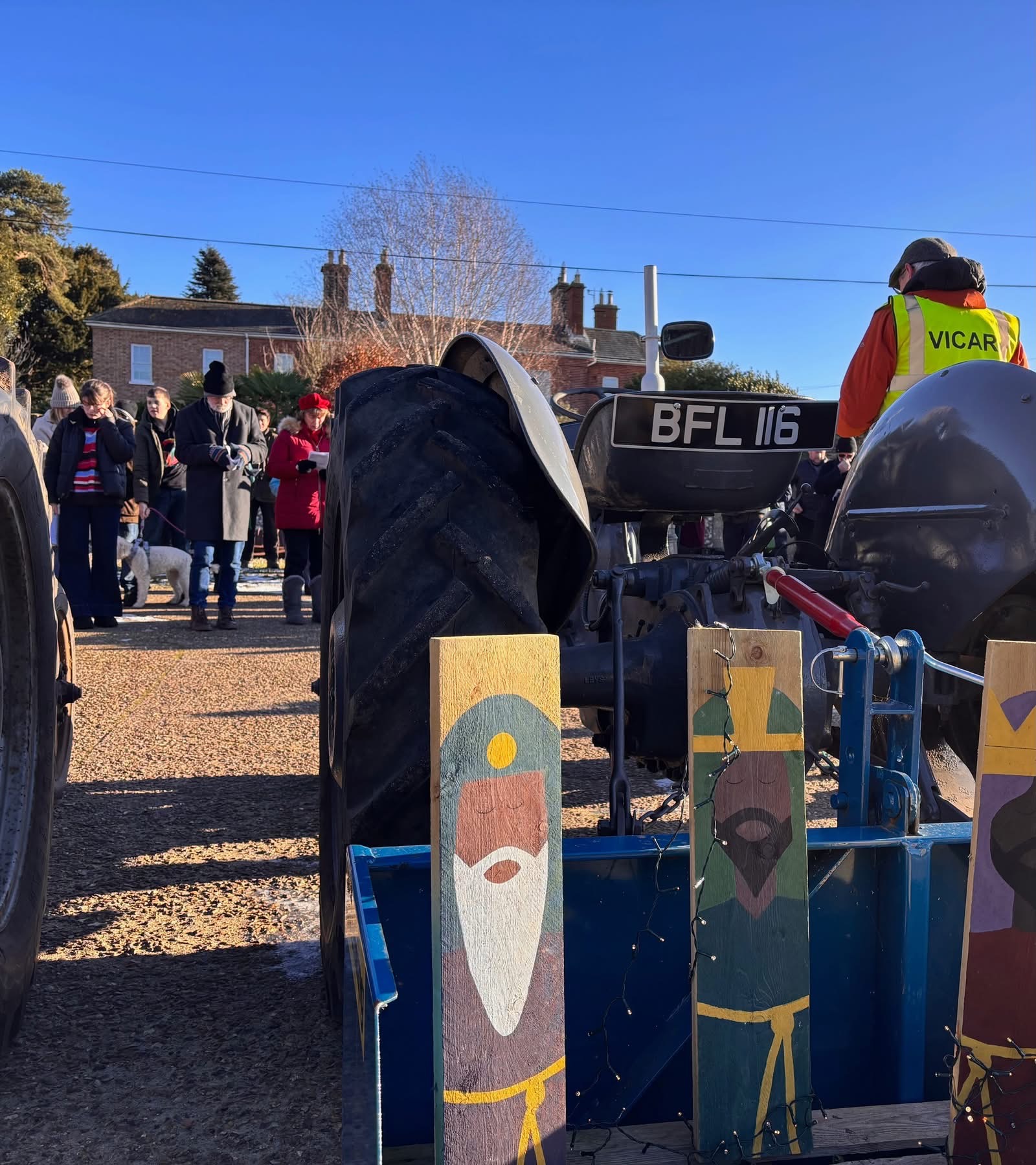 Over the last four years, the tradition has been reborn in Cawston by the local church, and on Sunday 4th January 2025 a procession of ten tractors, old and new, followed by over 80 villagers, walked from Sygate to Cawston in the winter sun. There was a singing stop outside Broadland Winery for a spot of carol singing, and then on to Church Farm where the tractors and ploughs were blessed. The procession finished in the church where there was a short act of worship involving the horse-drawn plough that was once used in the fields around Cawston, and the Three Wise Men, who arrived at the church on the back of the Vicar’s vintage tractor.