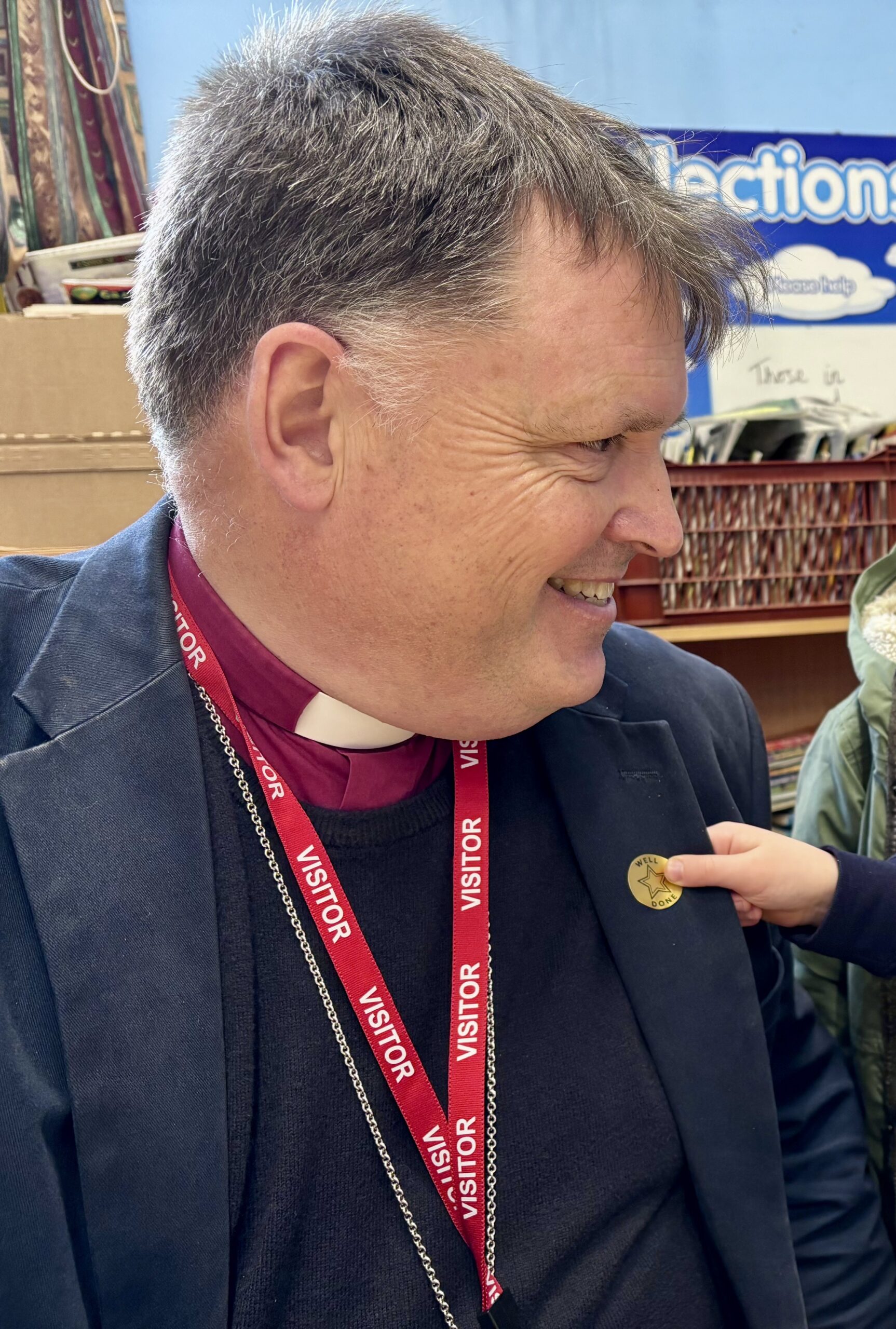 They gave Bishop Graham a tour of the garden they are creating – and a ‘Well Done’ sticker after he had eaten all his school lunch (cheesy pasta and cauliflower followed by a chocolate pudding.)